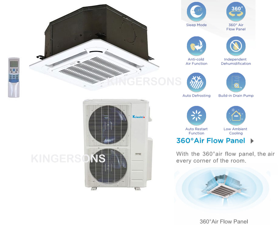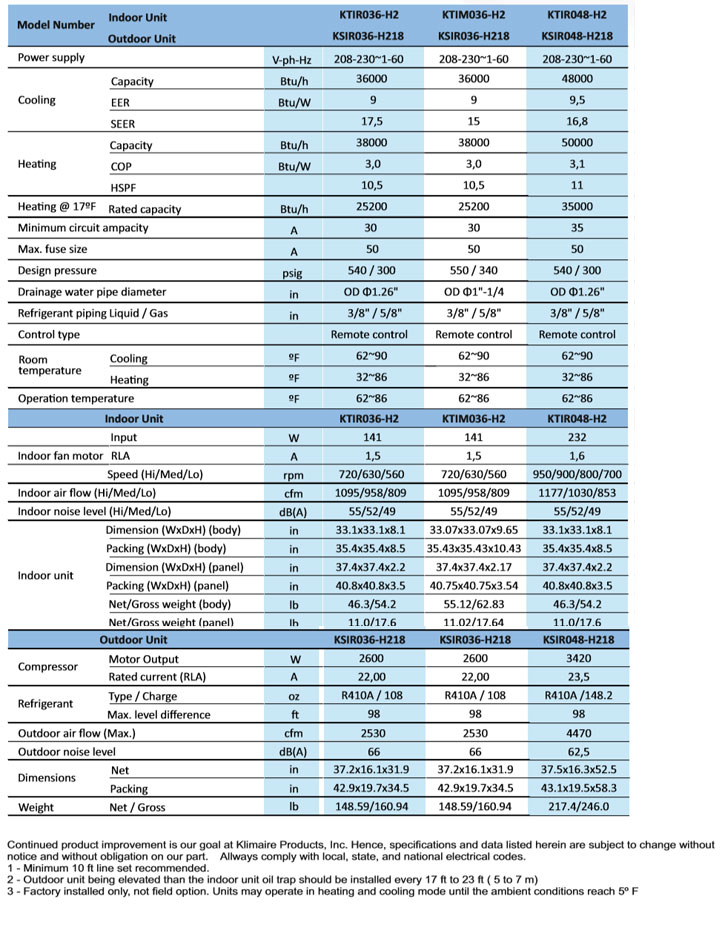 KTIR048-H2G1 | Indoor Unit Klimaire’s redesigned ceiling cassette ductless air conditioner units are recessed with a “hidden” design and easily installed in a 33.1” x 33.1” ceiling grid. KTIR units are ideal for commercial spaces like restaurants and retail stores. The unit’s off-white decorative panel blends easily with room and ceiling design. Each recessed ceiling cassette unit disperses air with an auto swing louver in 360-degree airflow for balanced comfort. A built-in condensate pump provides flexible and easy installation. Great features that the KTIR ceiling cassette units’ offer are follow me function, temperature compensation switch, powerful turbo fan operation, sleep mode, 5-degree low ambient heating/cooling just to name a few options that can be accessed with the remote control. Self-diagnosis and the unit’s off-white decorative panel makes maintenance simple and easier for a durable unit. * Coverage 2,000 Sq. Ft * Fit into standard 33.1” x 33.1” ceiling grid with "hidden" design * Flexible installation with a built-in drain pump * Each unit can share capacity with an adjacent room via flexible duct * The unit’s off-white decorative panel is removable for easy cleaning and blends easily with room and ceiling design. * Features fresh air intake design * Can be connected to an alarm and long distance on/off control KSIR | Outdoor Unit KSIR048-H218-O is a compact outdoor unit that requires minimal ground space and can be mounted to a wall with a wall mounting bracket (see accessories). Pre-charged up to 25 feet of refrigerant piping. An automatic defrost prevents condensation from freezing and damaging the compressor. The built-in base pan heater ensures reliable operation in temperature as low as 5º F. A built-in crank case heater protects your compressor for a longer lifespan. * Refrigerant leak detection * Double cam twin rotary compressor * Auto defrost, base pan heater plus crank case heater