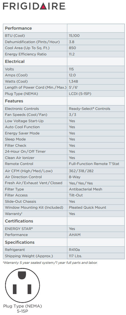 Product Name: Frigidaire FFRE15331 Window Air Conditioners 15000 BTU 115V