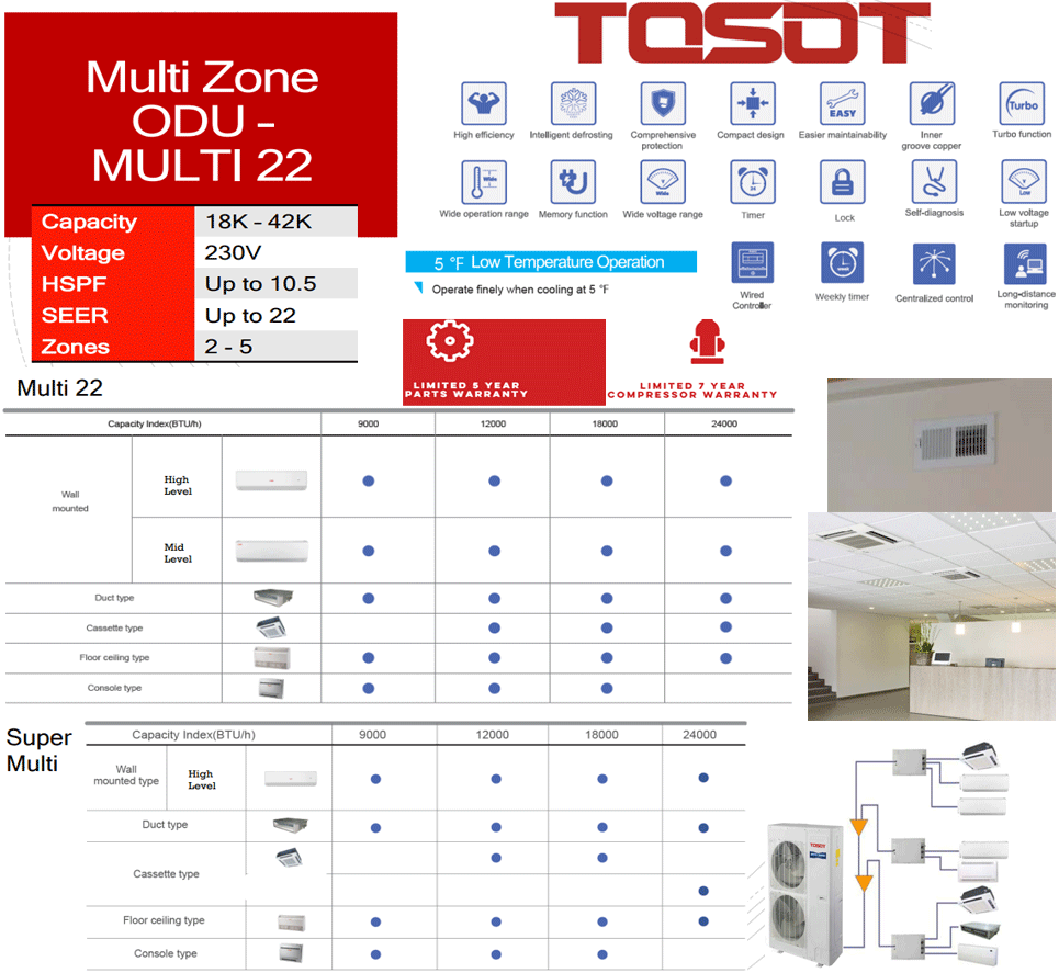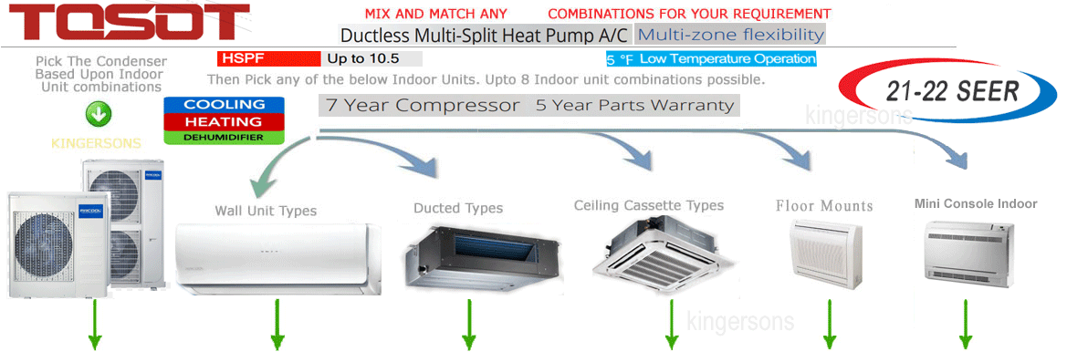 & Match For Any Combination You Need You can combine one 9000 btu Wall Mount unit with two 12000 btu Ceiling Mount for example with TOSOT or you can combine one standard wall mount 12000 btu unit with two 18000 btu Duct unit Or you can combine two Wall mount unit 12000 btu with one Ceiling Concealed duct . Any Combination is possible now with below sets. |