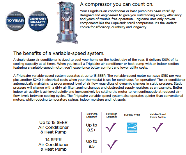 Your Frigidaire air conditioner or heat pump has been carefully designed and engineered to give you outstanding energy efficiency and years of trouble-free operation. Frigidaire uses only proven components like the Copeland® scroll compressor. It’s the leaders’ choice for efficiency, durability, and longevity. 16 SEER products feature a two-stage Ultra-tech scroll compressor. Two-stage technology allows your air conditioner or heat pump to operate at the most efficient level for total indoor comfort regardless of the outside temperature.
