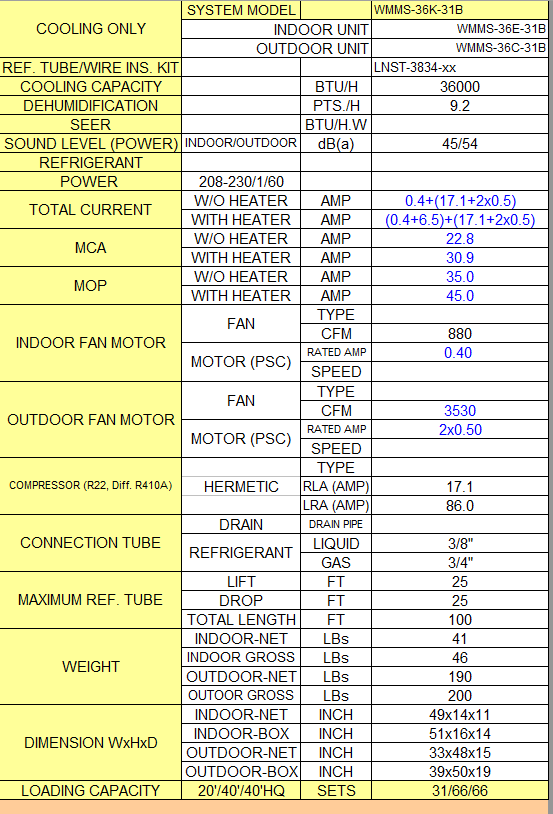 Model # WMMS-36K-31B - R22 REFRIGERANT