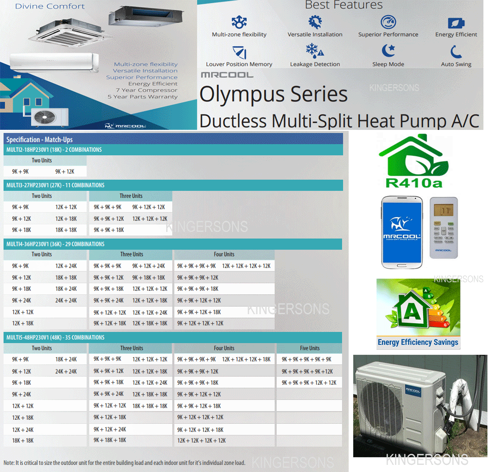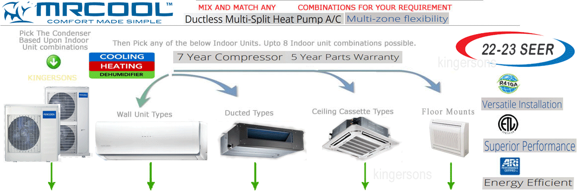 & Match For Any Combination You Need You can combine one 9000 btu Wall Mount unit with two 12000 btu Ceiling Mount for example with MRCOOL or you can combine one standard wall mount 12000 btu unit with two 18000 btu Duct unit Or you can combine two Wall mount unit 12000 btu with one Ceiling Concealed duct . Any Combination is possible now with below sets. |