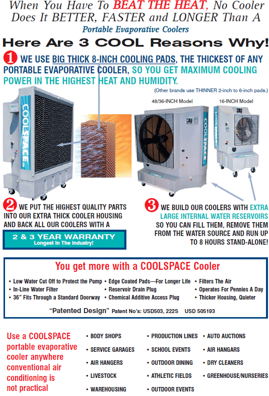 COOLSPACE technology combines water and forced air to reduce temperatures by as much as 28º. Additionally, the unit is portable and durable. Forget about installation with COOLSPACE - all you need is a water source and a 115 volt outlet.