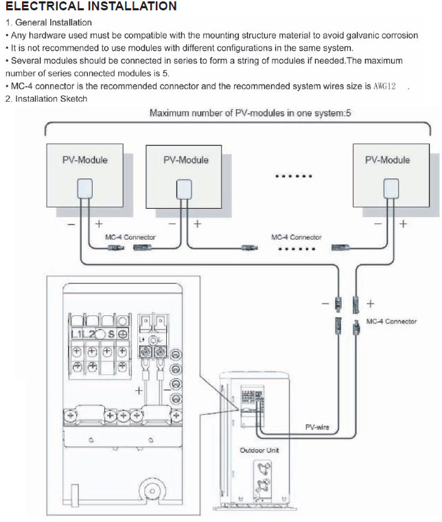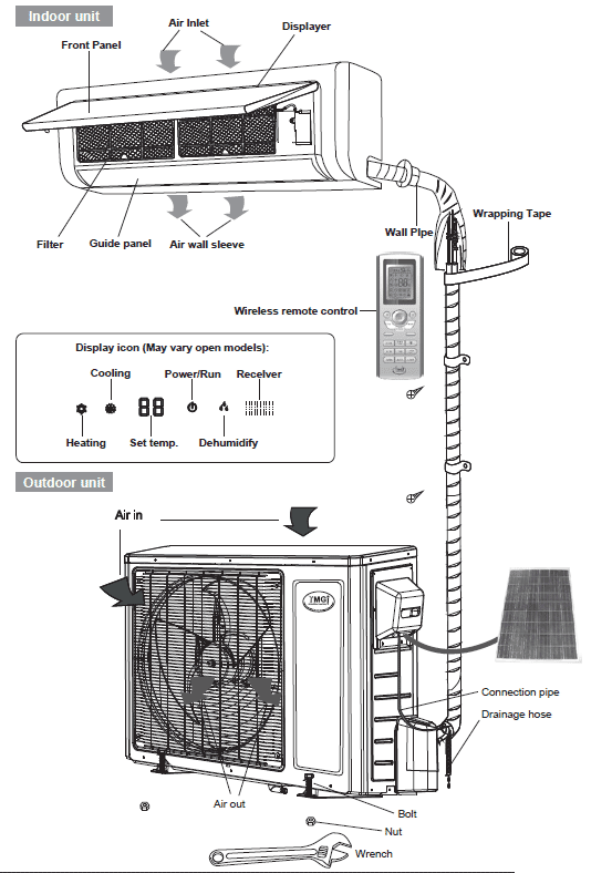 4. Two sets of installation kits. Copper piping: One set to connect the solar panel to outdoor unit, the other set to connect indoor unit and outdoor unit. Flare-nut connections.