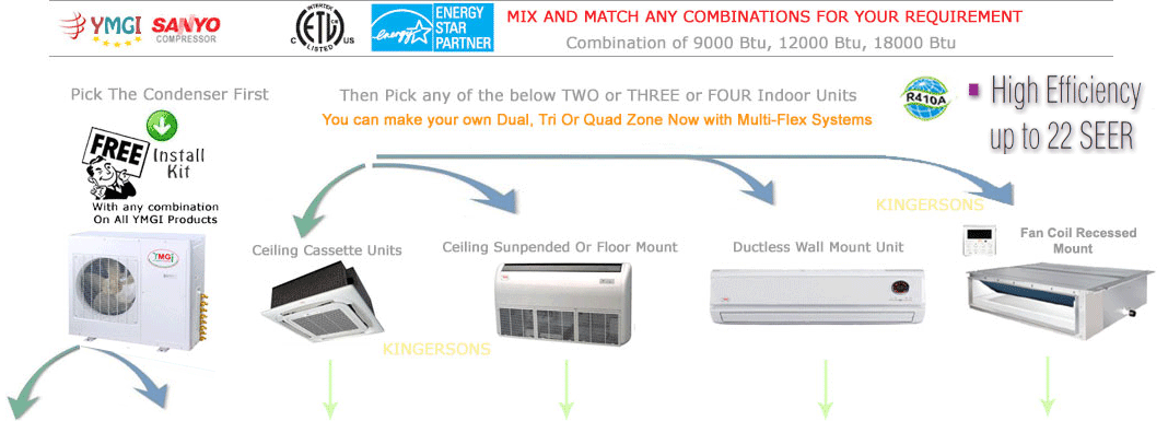 & Match For Any Combination You Need You can combine one 9000 btu Wall Mount unit with two 12000 btu Ceiling Mount for example with YMGI or you can combine one standard wall mount 12000 btu unit with two 18000 btu Mirror Panel from LG Or you can combine two Floor Mount unit 12000 btu with one Ceiling Concealed duct from Mitsubishi. Any Combination is possible now with below sets. |